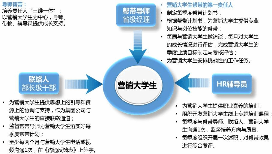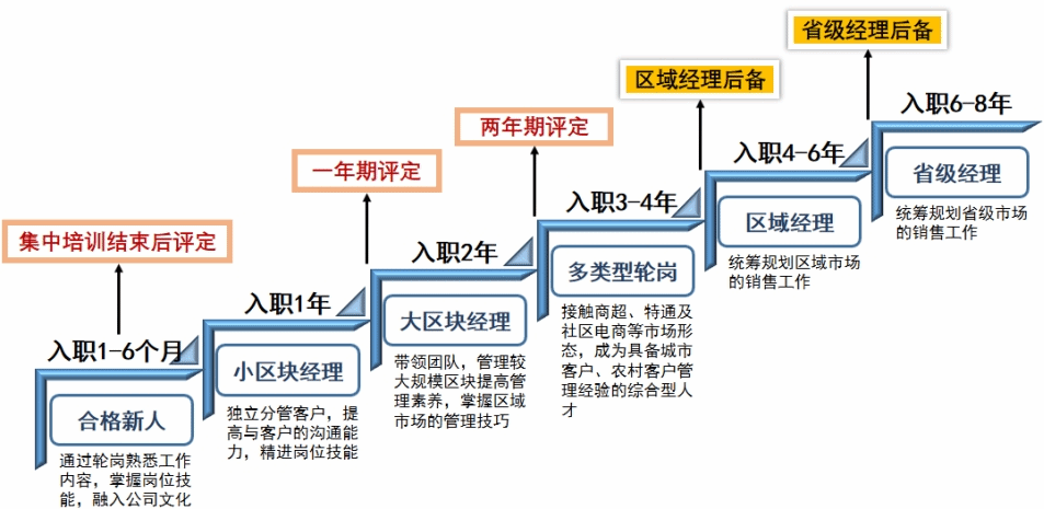 根据公司能者上、庸者下、平者让,不论资排辈,给年轻人机会的用人理念,营销将才作为销售管理干部储备军,由集团、销售公司、市场“三方培养、定期跟踪”,资深导师负责帮带,销售公司总经理、人力资源部部长等集团高管长期联络与关注!目标是3年时间培养成为优秀区域经理,6年后成长为新星省级经理!