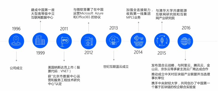 世纪互联(纳斯达克:VNET)成立于1996年,是全球具有重要影响力的网络空间基础设施服务提供商,也是中国领先的第三方中立数据中心运营商之一。作为中国卓越的互联互通网络平台,世纪互联致力于提供业界领先的数据中心服务、中立的云运营及中立的混合IT服务,并率先倡导和实施IDC+重科技创新,打造具有核心技术、超大规模运营能力的网络空间基础设施运营平台。世纪互联拥有近20年的数据中心建设、运维经验,目前在全国30多个城市运营50多个数据中心,拥有超过80000个机柜,端口容量高达1000G以上,具有优质的网络可靠性和稳定性,并提供高速的互联网及专线接入服务,是中国优秀的互联互通网络平台。