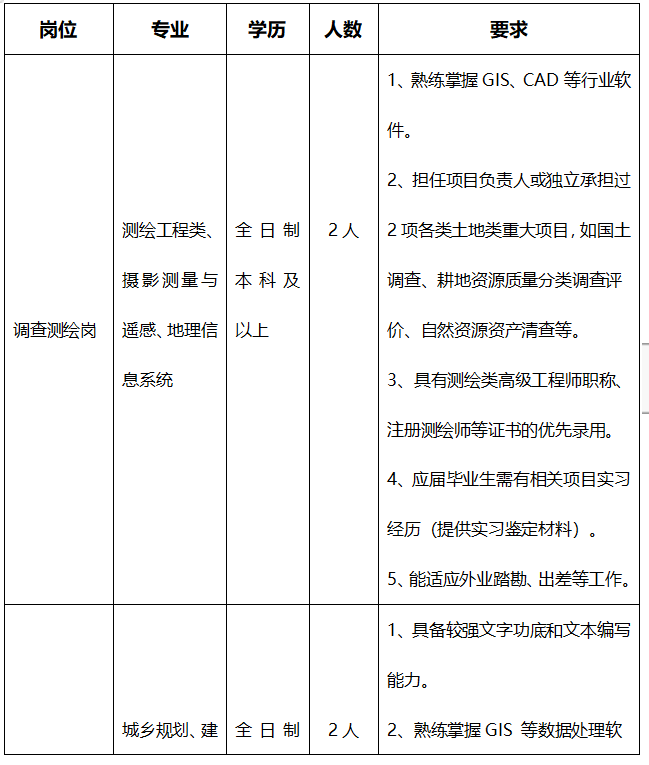 宿州市信诚自然资源勘测规划有限责任公司为宿州市自然资源勘测规划设计院下属国有企业,主要从事土地勘测定界、自然资源调查测绘、国土空间规划编制等工作。为加快宿州市自然资源勘测规划设计院高质量发展,充实人员力量,提高服务效能,根据工作需要,特面向社会公开诚聘专业技术人员,现就有关事项公告如下: