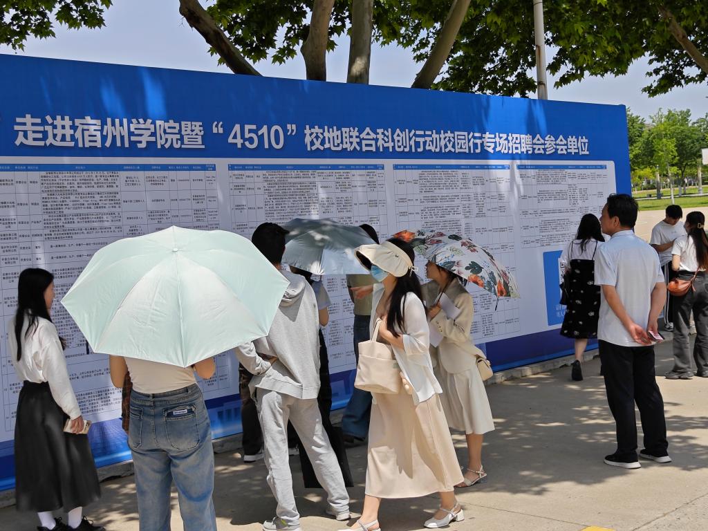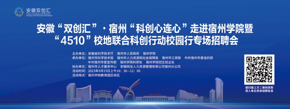 为全面贯彻落实党的二十大精神,落实省委、省政府促进高校毕业生就业创业工作的决策部署,进一步推动2023届毕业生就业工作,推进宿州市“4510”校地联合科创行动落地生根,5月23日,我校在教育园区校区成功举办安徽“双创汇”• 宿州“科创心连心”走进宿州学院暨“4510”校地联合科创行动校园行专场招聘会。