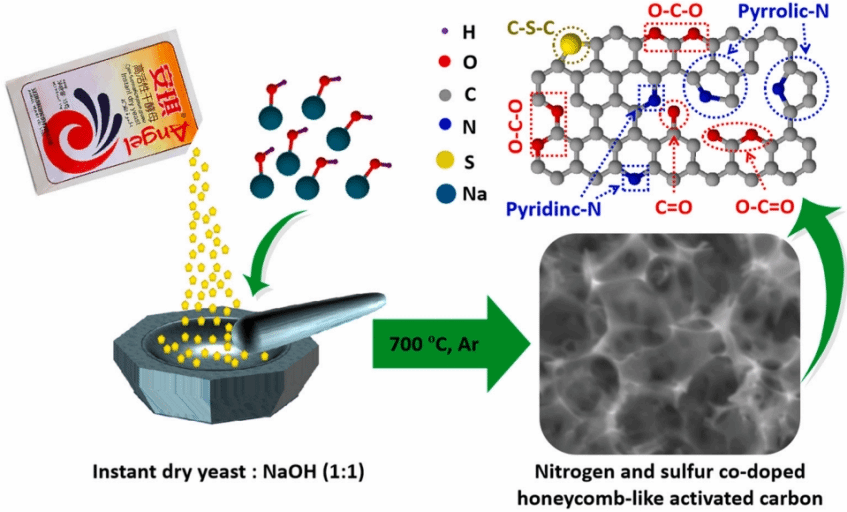 Diamond and Related Materials(影响因子:3.806)是材料科学类知名期刊。文章标题为“One-step production of N, S co-doped honeycomb-like activated carbon from instant dry yeast for high gravimetric and volumetric performance supercapacitors” (DOI: 10.1016/j.diamond.2022.109165)。联合培养研究生邵甲灿为第一作者,朱光教授和陈崇博士为该论文的共同通讯作者。该文章介绍了氮硫共掺杂蜂窝状活性炭电极材料的合成及其在超级电容器中的应用,该研究是以活性干酵母为碳前驱体通过炭化活化一步法制备出具有高比表面积和开孔结构的碳材料。研究成果为氮硫共掺杂蜂窝状多孔碳的制备提供了新的方法和思路,具有重要的学术和应用价值。