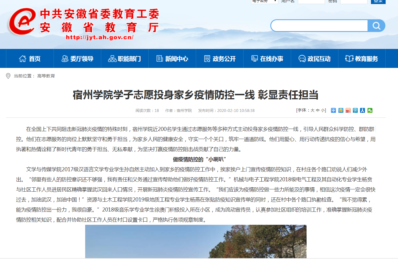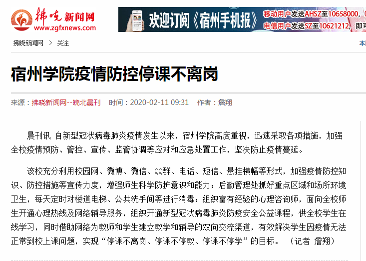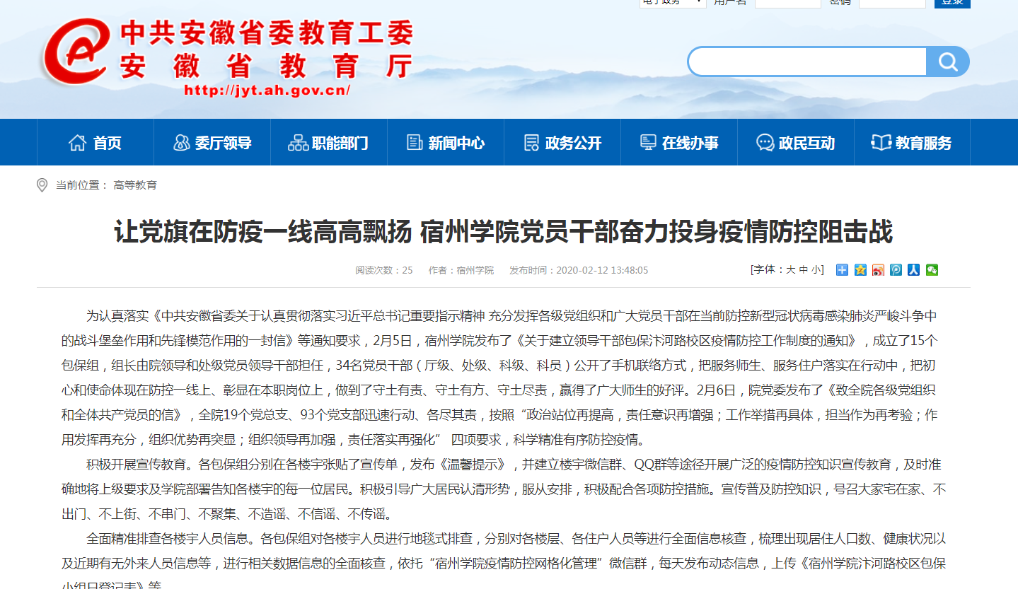 2月10日,《安徽教育网》首页以《宿州学院学子志愿投身家乡疫情防控一线 彰显责任担当》为题,对我校学生志愿投身家乡疫情防控一线,引导人民群众科学防控、群防群控的消息进行了报道。原文网址链接:http://jyt.ah.gov.cn/28/view/671554.shtml编辑:张苗 审核:李真 新闻编号:20022