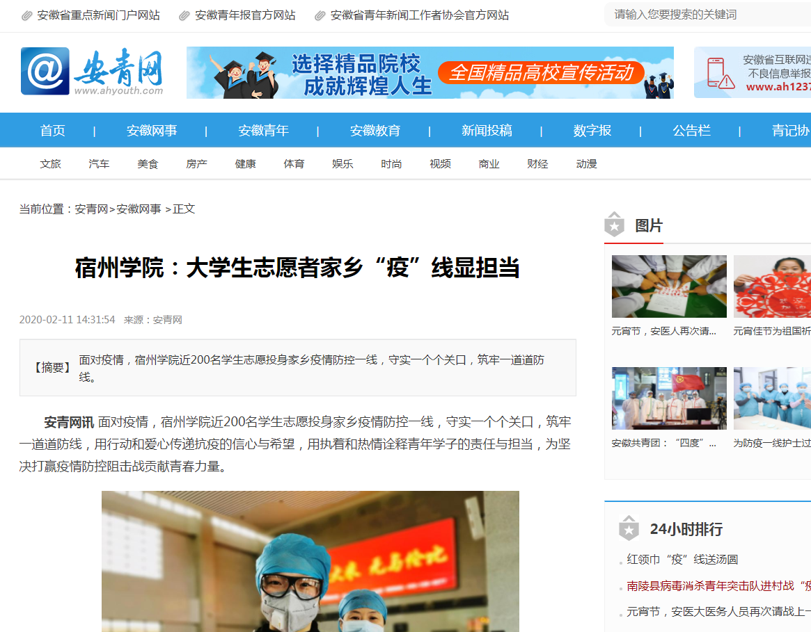 2月11日,《安青网》以《宿州学院:大学生志愿者家乡“疫”线显担当》为题,对我校学生志愿投身家乡疫情防控一线,彰显责任担当的消息进行了报道。原文网址链接:http://www.ahyouth.com/news/20200211/1426607.shtml编辑:张苗 审核:李真 新闻编号:20023