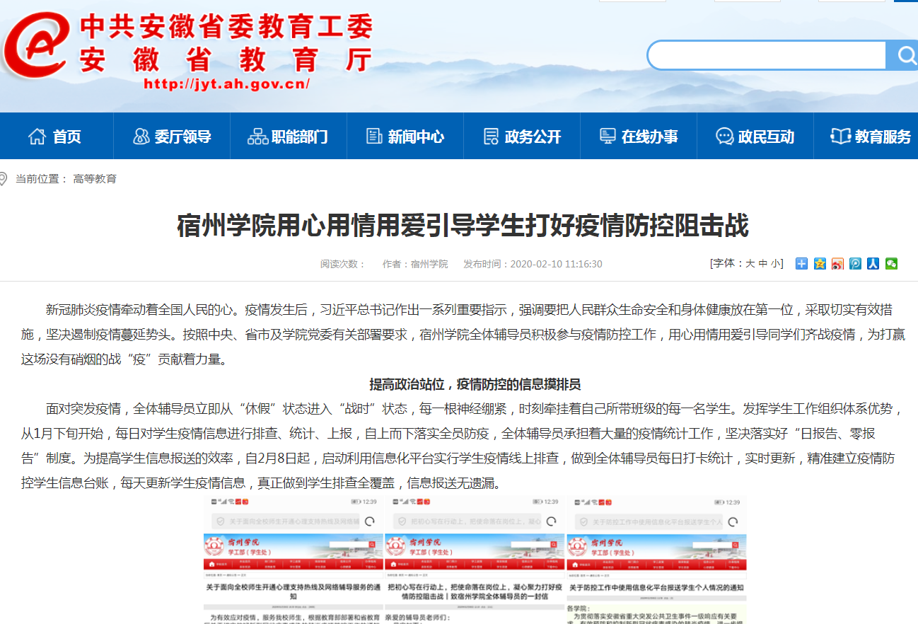2月10日,《安徽教育网》首页以《宿州学院用心用情用爱引导学生打好疫情防控阻击战》为题,对我校全体辅导员积极参与疫情防控工作,用心用情用爱引导同学们齐战疫情的消息进行了报道。原文网址链接:http://jyt.ah.gov.cn/28/view/671557.shtml编辑:张苗 审核:李真 新闻编号:20022