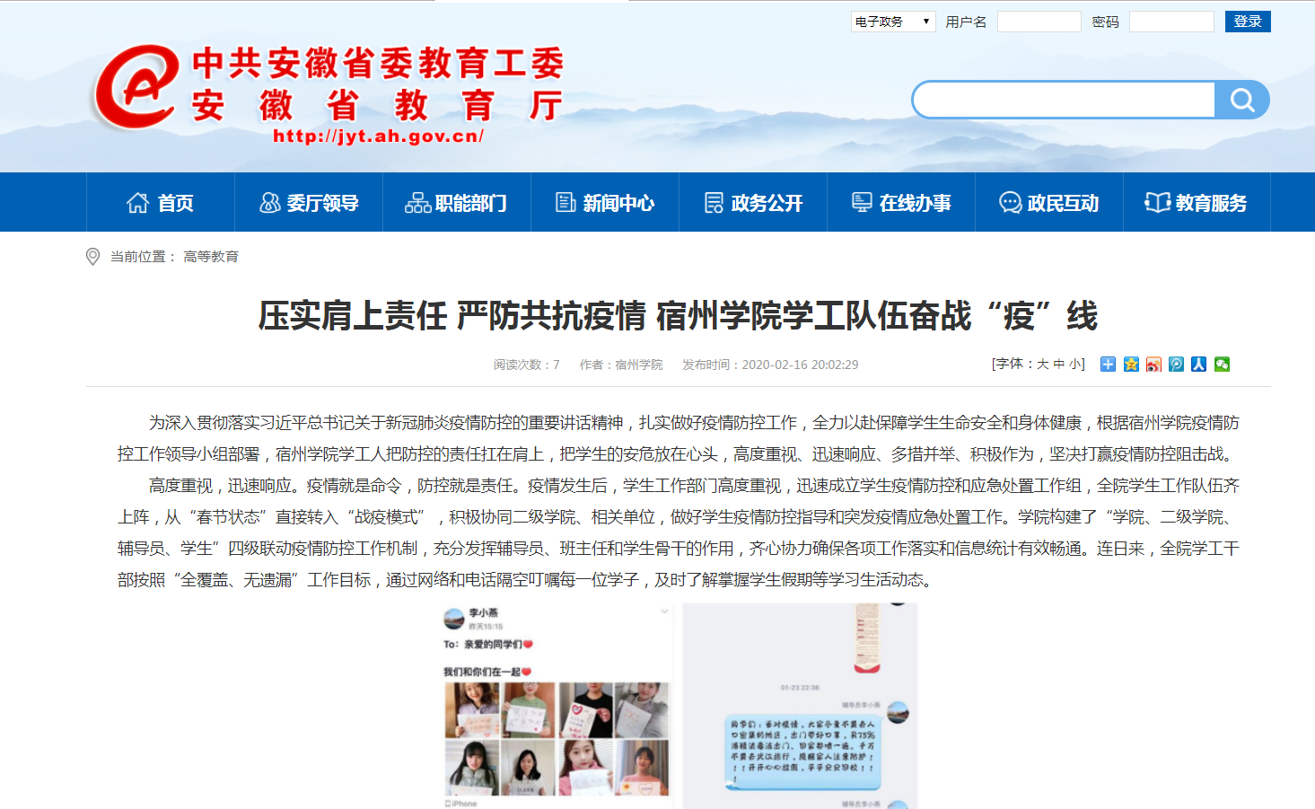 17/ 2020-022月16日,《安徽教育网》首页以《宿州学院扛牢扛实疫情防控责任 坚决阻断疫情向学院蔓延》为题,对我校召开党委会疫情防控专题工作会议,通报、交流学院前期有关疫情防控工作,根据最新形势对下一阶段学院疫情防控工作进行再研究、再部署、再推进的消息进行了报道。原文网址链接:http://jyt.ah.gov.cn/28/view/672063.s...