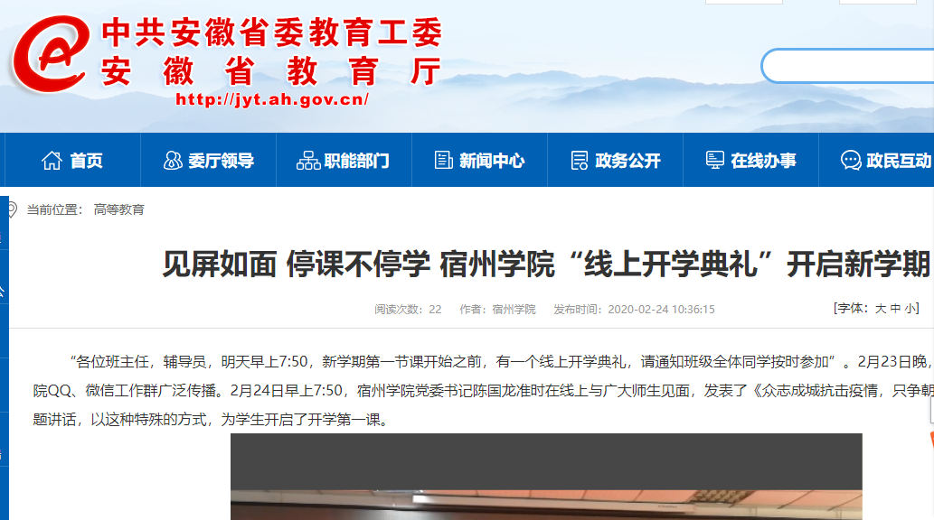 2月24日,《安徽教育网》首页以《见屏如面 停课不停学 宿州学院“线上开学典礼”开启新学期》为题,对我校今天举办“线上开学典礼”的消息进行了报道。原文网址链接:http://jyt.ah.gov.cn/28/view/672877.shtml编辑:张苗 审核:李真 新闻编号:20026