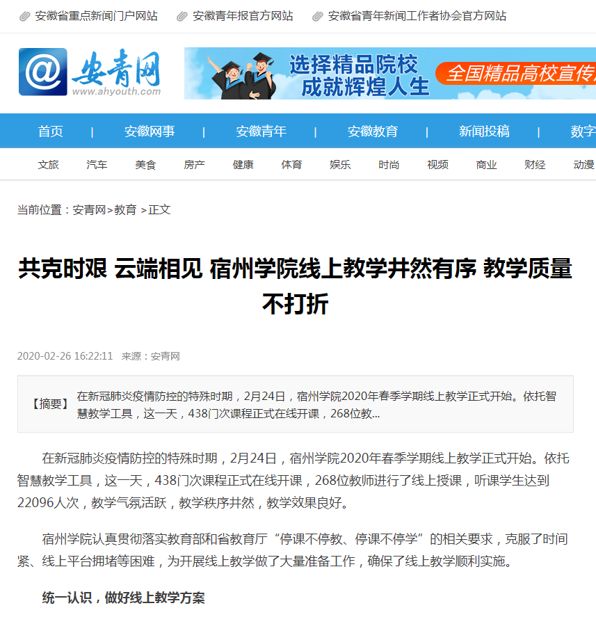 2月26日,《安青网》以《共克时艰 云端相见 宿州学院线上教学井然有序 教学质量不打折》为题,对我校线上教学秩序井然的消息进行了报道。原文网址链接:http://www.ahyouth.com/news/20200226/1431323.shtml编辑:张苗 审核:李真 新闻编号:20027