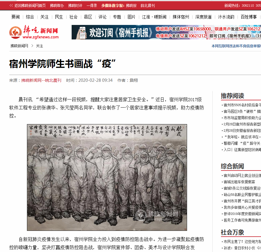 2月28日,《皖北晨刊》《拂晓新闻网》以《宿州学院师生书画战“疫”》为题,对我校师生创作艺术作品助力战“疫”的消息进行了报道。原文网址链接:http://www.zgfxnews.com/gz/content/2020-02/28/content_236909.htm编辑:张苗 审核:李真 新闻编号:20027