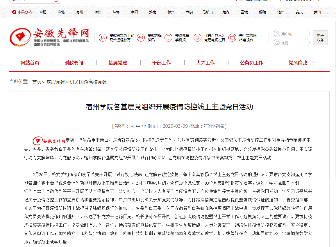 10/ 2020-033月10日,《安徽教育网》“全力做好新冠肺炎疫情防控工作专题网”“一线传真”栏目以《践行初心使命 让党旗在防控疫情斗争中高高飘扬 宿州学院开展线上主题党日活动》为题,对我校开展线上主题党日活动的消息进行了报道。原文网址链接:http://jyt.ah.gov.cn/2104/view/674407.shtml编辑:张苗 审核:李真 新闻编号:200...