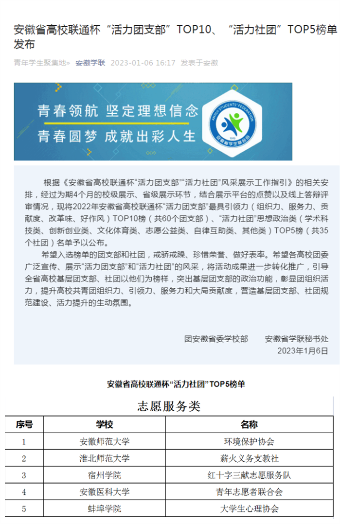 近日,由团安徽省委学校部、安徽省学联秘书处举办的安徽省高校联通杯“活力社团”风采展示活动结果公布,宿州学院红十字三献志愿服务队获评“活力社团”志愿公益类TOP5榜。宿州学院红十字三献志愿服务队是经校团委批准并备案的学生活动社团,由机械与电子工程学院发起成立。社团在校团委的领导下广泛开展“三献”活动...