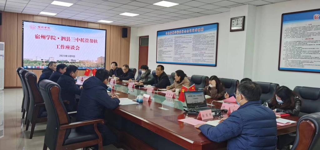 1月9日下午,宿州学院•泗县第三中学托管帮扶工作座谈会在宿州学院逸夫楼A504会议室召开。泗县第三中学副校长董丙杰一行4人,宿州学院党委委员、副院长李亮,宿州学院相关职能部门及二级学院负责人参会,会议由教务处处长王红艳主持。李亮对泗县三中各位领导的到来表示欢迎。李亮指出,按照《安徽省教育厅关于组织实施...