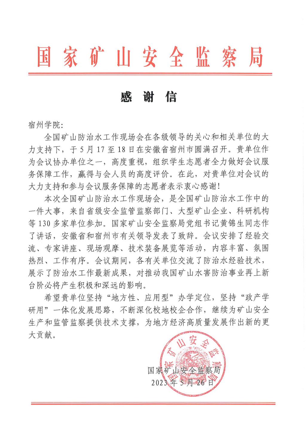近日,我校收到国家矿山安全监察局的感谢信,对我校高度重视协办全国矿山防治水工作现场会,积极组织大学生志愿者全力做好会议服务保障工作,表示衷心感谢!5月17日至18日,全国矿山防治水工作现场会在宿州召开。宿州学院团委、资源与土木工程学院积极组织10余位老师、40余位大学生志愿者,全力做好会议各项服务保障工作...