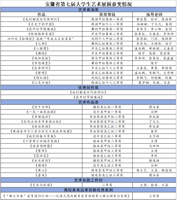 日前,安徽省第七届大学生艺术展演活动评选结果揭晓,我院艺术表演节目获一等奖3项、二等奖4项、三等奖7项,艺术作品获一等奖2项、二等奖7项、三等奖6项,《艺术与校园》获艺术实践工作坊二等奖,《“薪火青春”美育浸润行动——沉浸式思政教育美育协同育人模式探索与实践》获高校美育改革创新优秀案例三等奖,学校荣获...