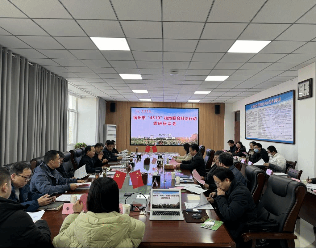 1月5日下午,宿州市“4510”校地联合科创行动调研座谈会在宿州学院教育园区校区逸夫楼A504举行。宿州学院党委委员、副校长杨维志参加并主持会议。市委政研室、市经信局、市人社局、市科技局、市发改委,宿州学院有关二级学院和部门负责人,企业代表等参加了会议。杨维志传达了习近平总书记关于教育、科技、人才“三位一...