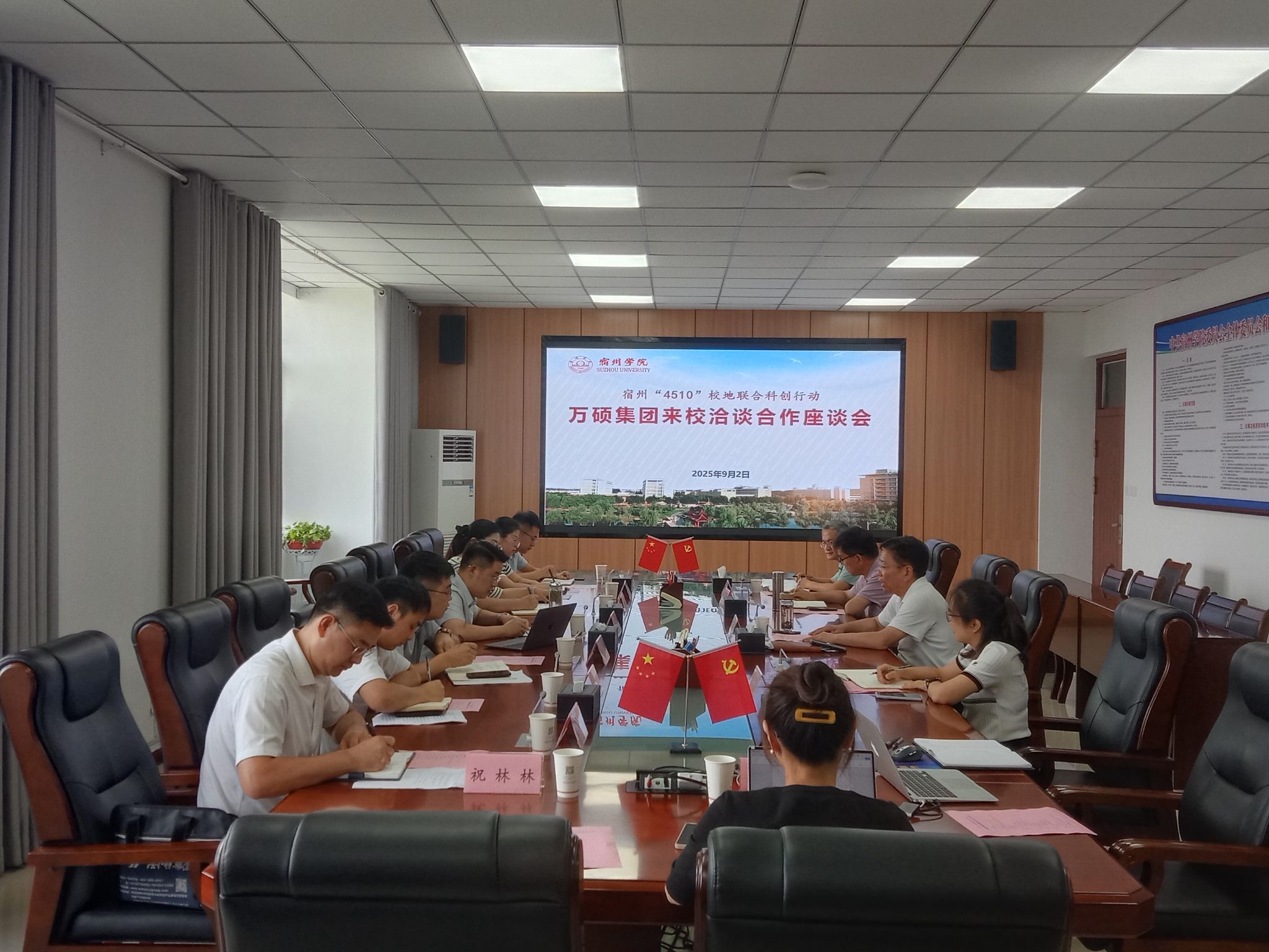 9月2日,万硕集团董事长祝云辉等一行9人来校洽谈合作。校党委常委、副校长杨维志出席并主持座谈会。杨维志简要介绍了学校的办学历史、人才培养、发展目标、校地合作等情况。他指出,学校的发展离不开地方企事业单位的大力支持,此次座谈会为深化校企合作搭建了平台,希望双方在知识产权申报、技术成果转化、社会服务与社...
