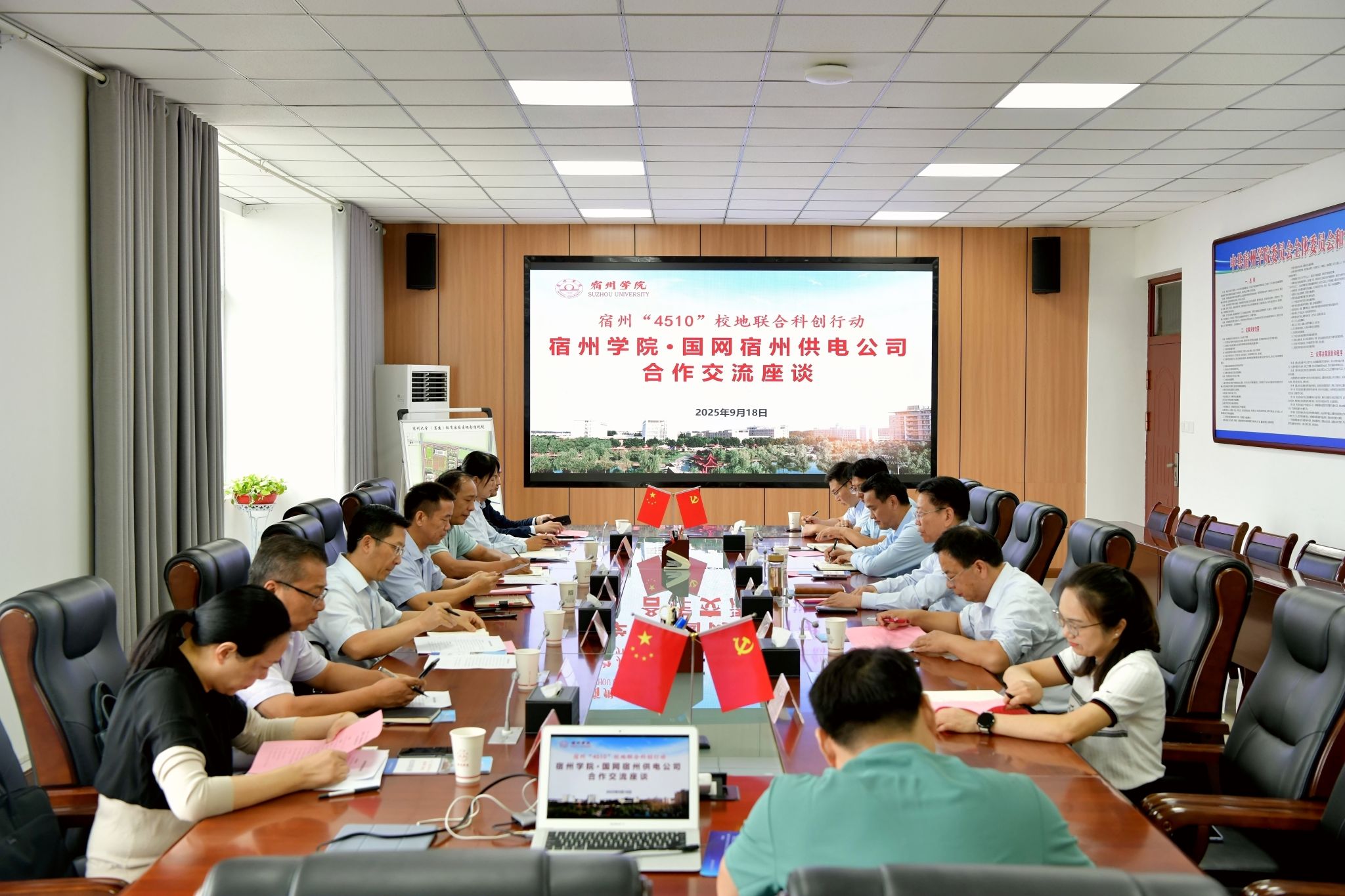 9月18日上午,国网宿州供电公司总经理钟成元一行7人来校开展合作交流。校党委常委、副校长杨维志出席并主持座谈会。后勤与基建管理处、继续教育学院、就业与校地合作处、机械与电子工程学院等单位主要负责人参加座谈会。杨维志简要介绍了学校办学基本情况以及“4510”校地联合科创行动等情况,希望校企双方进一步密切联...