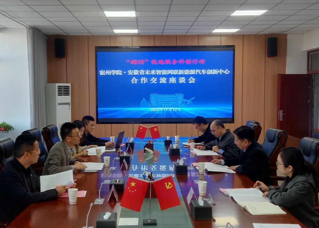 11月12日上午,安徽省未来智能网联新能源汽车创新中心产才融合中心主任郭铁一行4人来校考察交流。校党委常委、副校长杨维志主持召开座谈会。就业与校地合作处、机械与电子工程学院等主要负责同志参加会议。杨维志介绍了学校办学基本情况、发展目标、校园建设规划以及“4510”校地联合科创行动等。他表示,双方在产教融合...