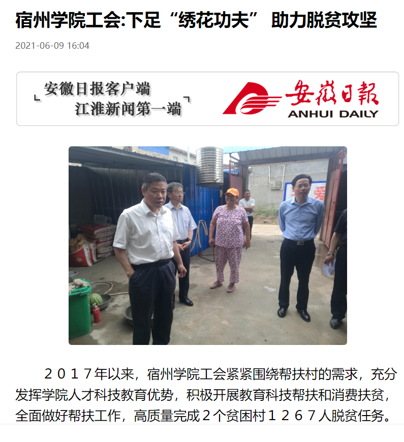 6月9日,《安徽日报》客户端以“宿州学院工会:下足‘绣花功夫’助力脱贫攻坚”为题,报道我院工会定点扶贫工作的具体做法、取得的成效及被省委、省政府授予全省脱贫攻坚“先进集体”荣誉称号。学院工会将以此为起点,再接再厉,认真贯彻落实习近平总书记关于真抓实干做好新阶段“三农”工作重要指示精神、践行党的初心使...