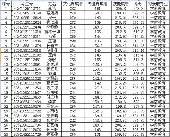 现对预录取考生名单进行公示,公示时间6月15日—6月19日,如有异议,请于6月19日17:00前以书面形式反馈到宿州学院招生就业处(联系电话:0557-2875361,传真:0557-2875360),也可直接向宿州学院纪委办公室(监察专员办公室)反馈(电话:0557-2875950)。预录取名单如下: