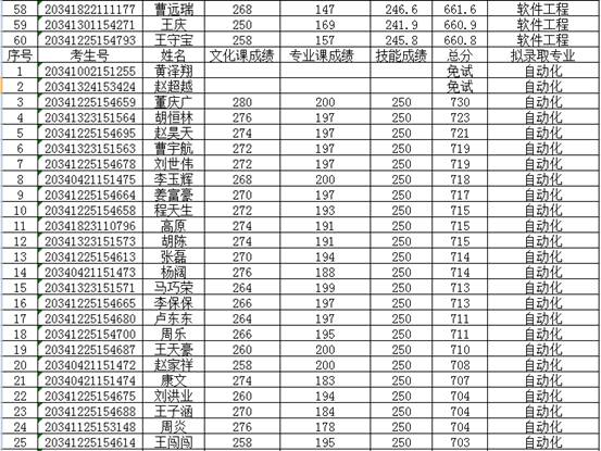 我校2020年面向中职毕业生对口招生考试的各阶段、各环节的工作已全部结束,根据《宿州学院2020年面向中职毕业生对口招生章程》中的录取原则,我校学前教育专业预录取60人,录取最低分数线为575.6分;表演(泗州戏方向)专业预录取10人,录取最低分数线为605.33分;软件工程专业预录取60人(其中6人为预免试录取),录取最低分数线为660.8分;自动化专业预录取60人(其中2人为预免试录取),录取最低分数线为593分;酒店管理专业预录取110人,录取最低分数线为610.67分。