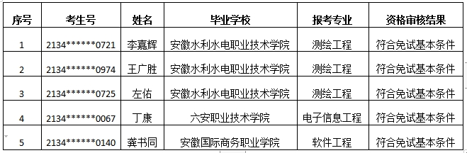 根据《宿州学院2021年普通专升本招生章程》招生录取鼓励政策,经考生本人自愿申请,我校招生工作组审核,李嘉辉等5位考生的免试申请符合我校普通专升本招生章程规定的免试基本条件,现将免试资格审核结果公布如下。