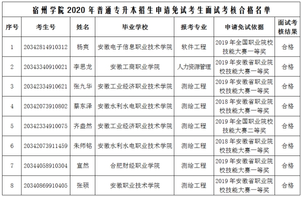 根据《宿州学院2020年普通专升本招生章程》,经考生本人自愿申请,我校招生工作组审核,杨爽等15位考生的免试申请符合我校普通专升本招生章程规定的免试基本条件。后经面试专家小组面试考核,杨爽等8位考生的面试考核合格,现将面试考核合格考生名单予以公示。