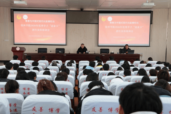 为充分发挥优秀学子榜样力量,助力学校招生宣传工作。1月6日,教务处联合团委在逸夫楼第二会议室举行“青春为中国式现代化挺膺担当”宿州学院2026年优秀学子“返乡”招生宣传社会实践培训会。学校招生办负责同志及近200名学生代表齐聚一堂,共话招生宣传新思路。